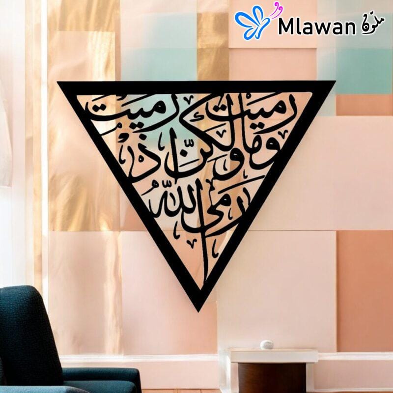 Islamic Wall Art Triangular Wooden Décor | “وما رميت إذ رميت ولكن الله رمى” | Elegant Home Decoration