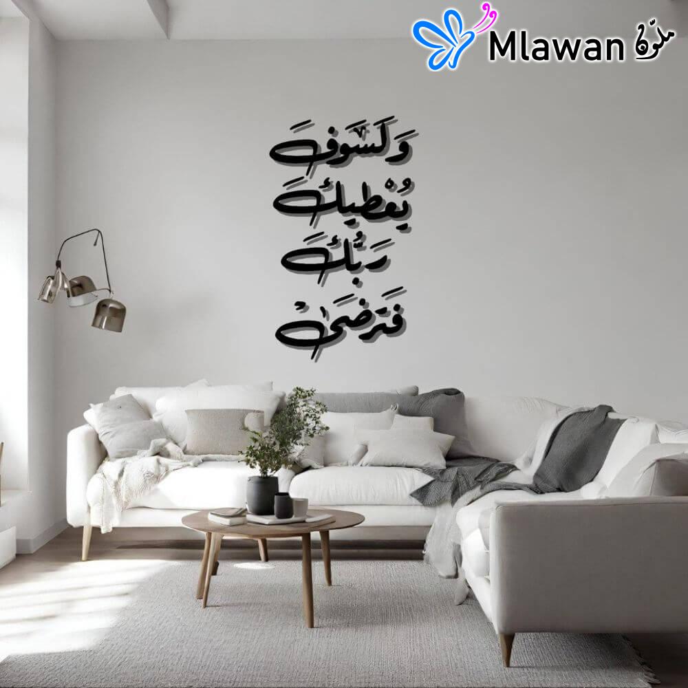 جدارية ثلاثية الأبعاد بخط عربي إسلامي تحمل آية “ولسوف يعطيك ربك فترضى”، تجسد الأمل والإيمان. تُضفي لمسة روحانية وجمالية على أي مكان.