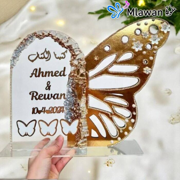 The butterfly theme symbolizes transformation, joy, and new beginnings, perfectly capturing the essence of your wedding or Katb Ktab. The elegant design complements any décor.